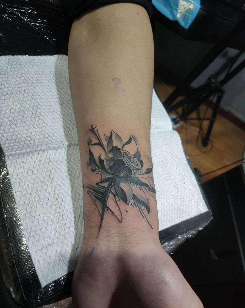 当前位置: 首页 >山东省济南市纹身店-灵渡刺青纹身图案>荷花遮盖纹身图片_手臂手部老传统水墨纹身图案