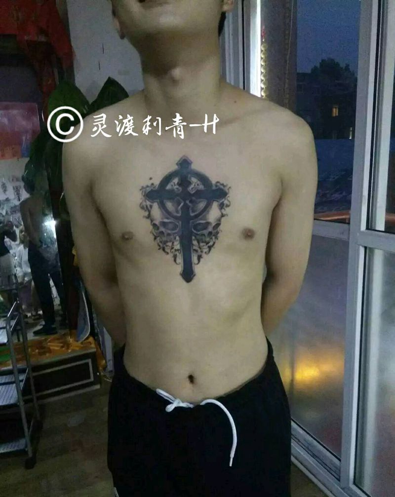 十字架骷髅纹身图片_胸部欧美宗教成品纹身图案