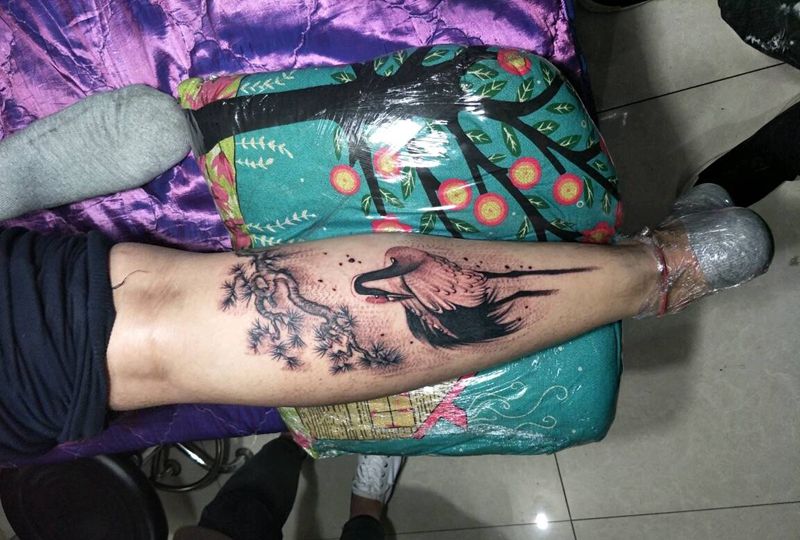 当前位置: 首页 >山东省济南市纹身店-灵渡刺青纹身图案>水墨鹤纹身图片_腿部传统动物成品纹身图案