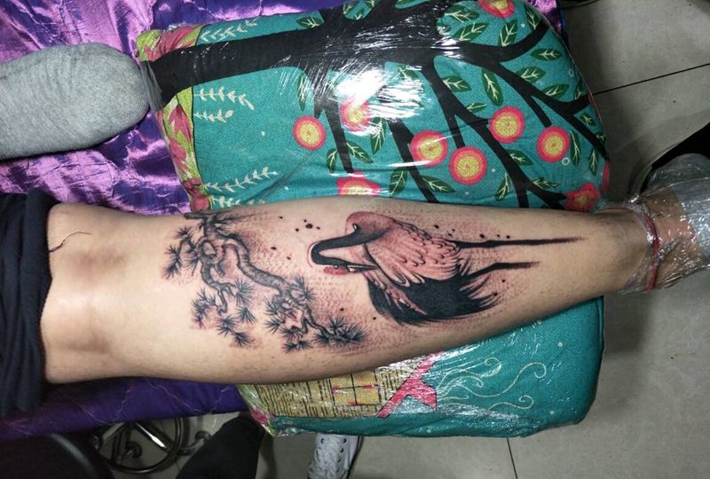 当前位置: 首页 >山东省济南市纹身店-灵渡刺青纹身图案>水墨鹤纹身图片_腿部传统动物成品纹身图案