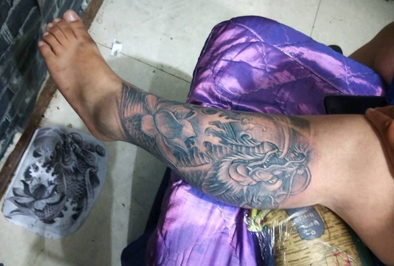 • T网红王老大花腿龙纹身图片_腿部新传统纹身图案