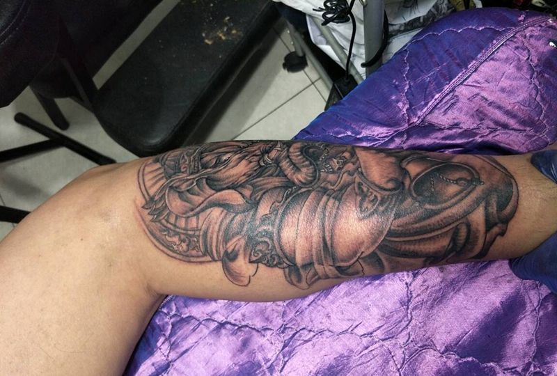 当前位置: 首页 >山东省济南市纹身店-灵渡刺青纹身图案>小腿象神纹身图片_腿部传统动物鬼神手稿纹身图案