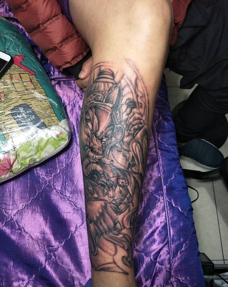 当前位置: 首页 >山东省济南市纹身店-灵渡刺青纹身图案>小腿象神纹身图片_腿部传统动物鬼神手稿纹身图案