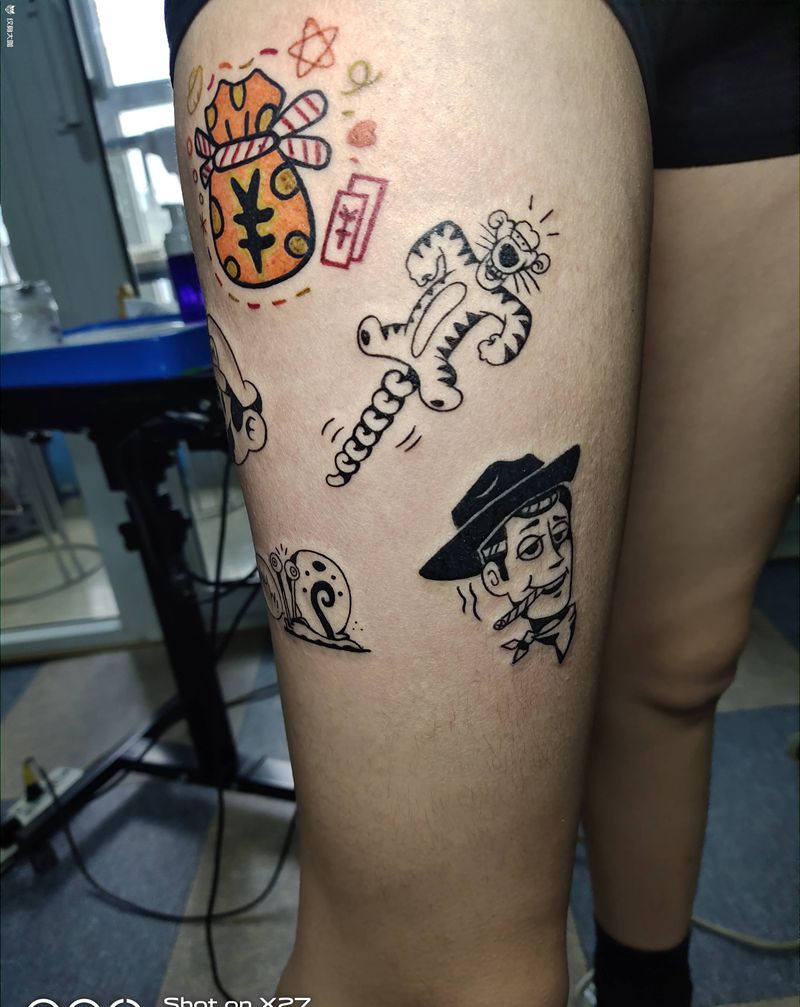 当前位置: 首页 >山东省济南市纹身店-济南老男孩刺青纹身图案>小图纹身图片_腿部New School纹身图案