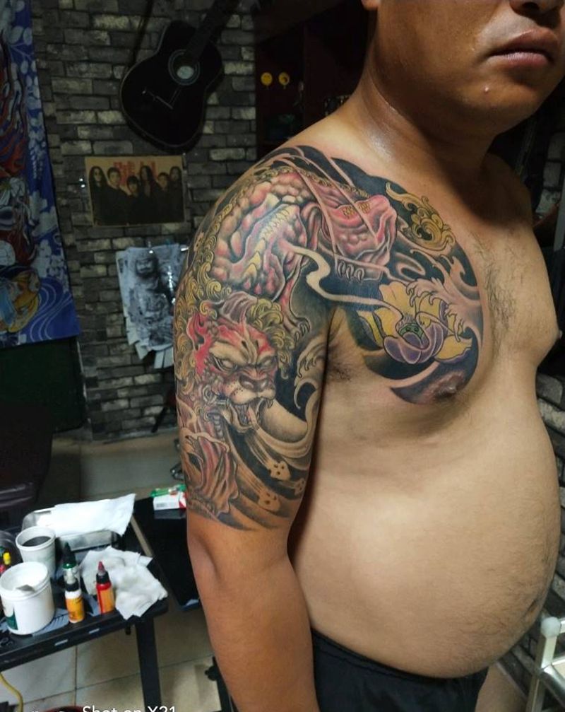 当前位置: 首页 >山东省济南市纹身店-济南老男孩刺青纹身图案>貔貅半甲纹身图片