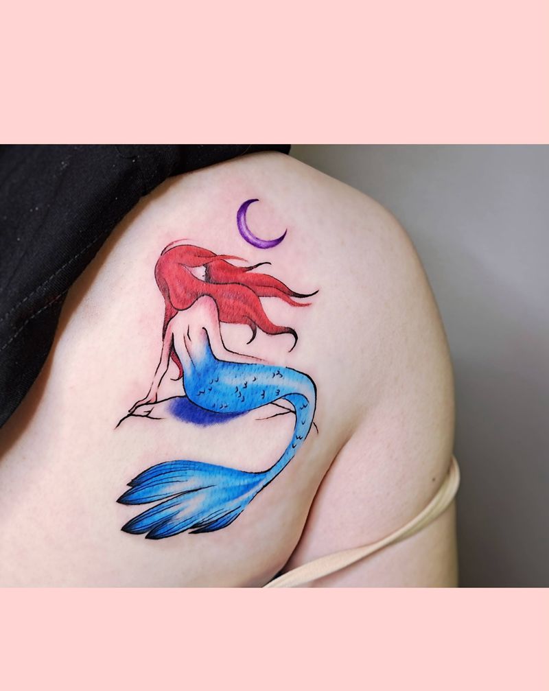 美人鱼纹身图片_背部水彩美人鱼月亮纹身图案