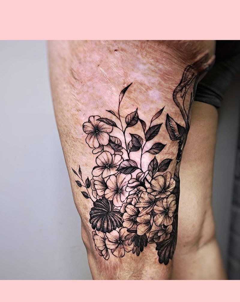 鹿与花纹身图片_腿部遮盖鹿素花纹身图案