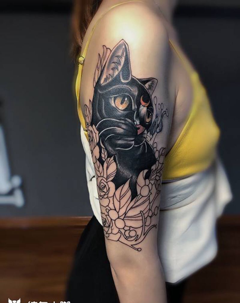 黑猫纹身图片_手臂肩部New School猫纹身图案