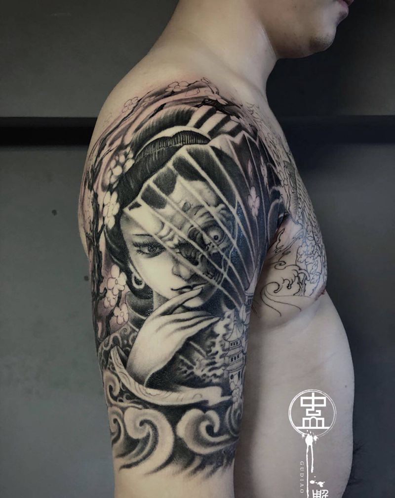 艺妓纹身图片_手臂肩部新传统艺妓纹身图案