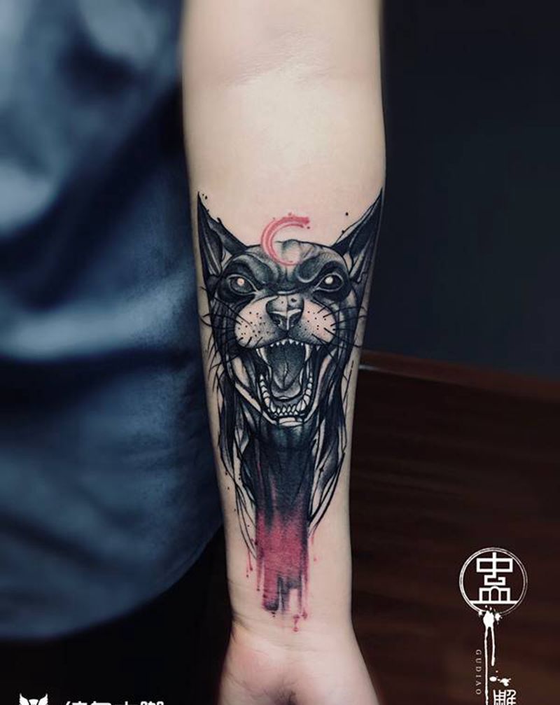 当前位置: 首页 >山东省济南市纹身店-将·刺青纹身图案>司芬克斯猫纹身图片_手臂欧美写实水彩猫比鲁斯大人司芬克斯纹身图案