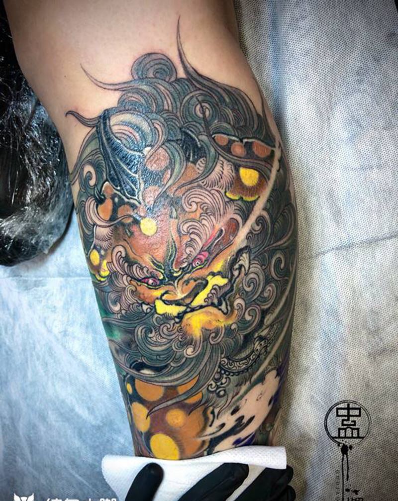 唐狮纹身图片_腿部新传统唐狮谛听纹身图案