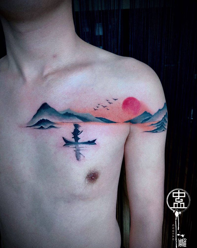 山水纹身图片_肩部胸部水墨水彩山水纹身图案
