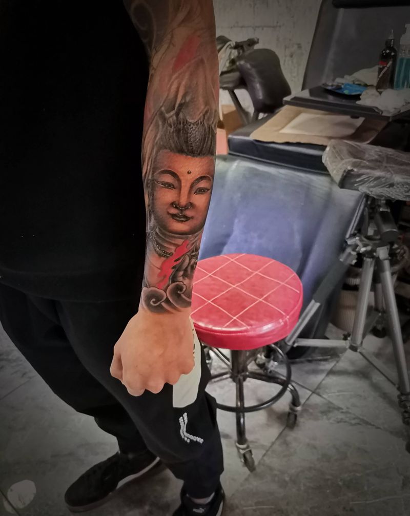 当前位置: 首页 >山东省济南市纹身店-济南花姐刺青纹身图案>小臂观音修改纹身图片_手臂老传统新传统纹身图案