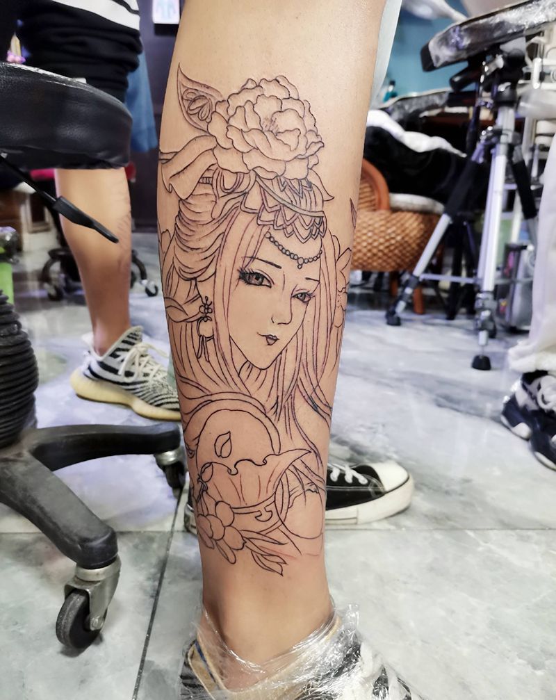 当前位置: 首页 >山东省济南市纹身店-济南花姐刺青纹身图案>艺妓线条,小腿纹身图片_腿部老传统新传统纹身图案