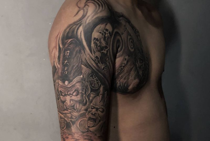 黑白无常纹身图片_肩部胸部新传统纹身图案