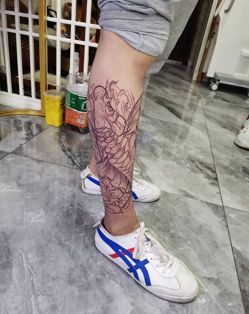 • T网红王老大花腿龙纹身图片_腿部新传统纹身图案
