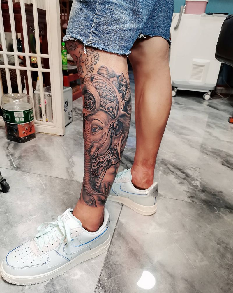 当前位置: 首页 >山东省济南市纹身店-济南花姐刺青纹身图案>小腿象神纹身图片_腿部手臂老传统新传统纹身图案