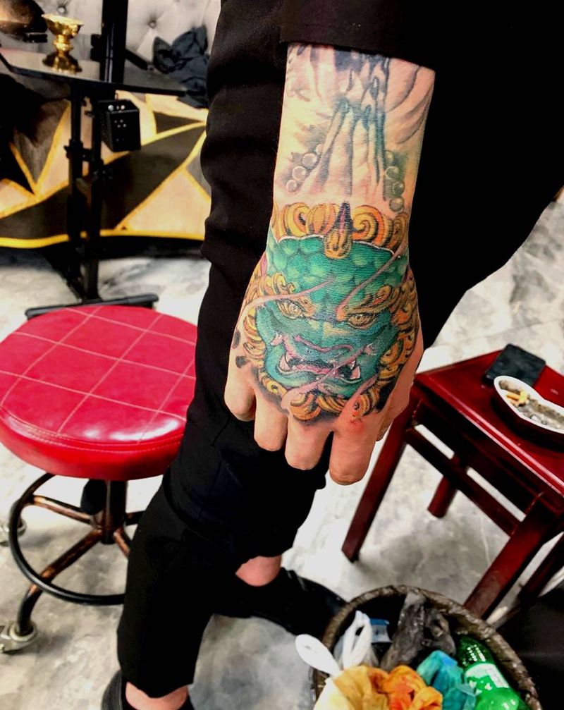 当前位置: 首页 >山东省济南市纹身店-济南花姐刺青纹身图案>唐狮花手纹身图片_手部新传统老传统纹身图案