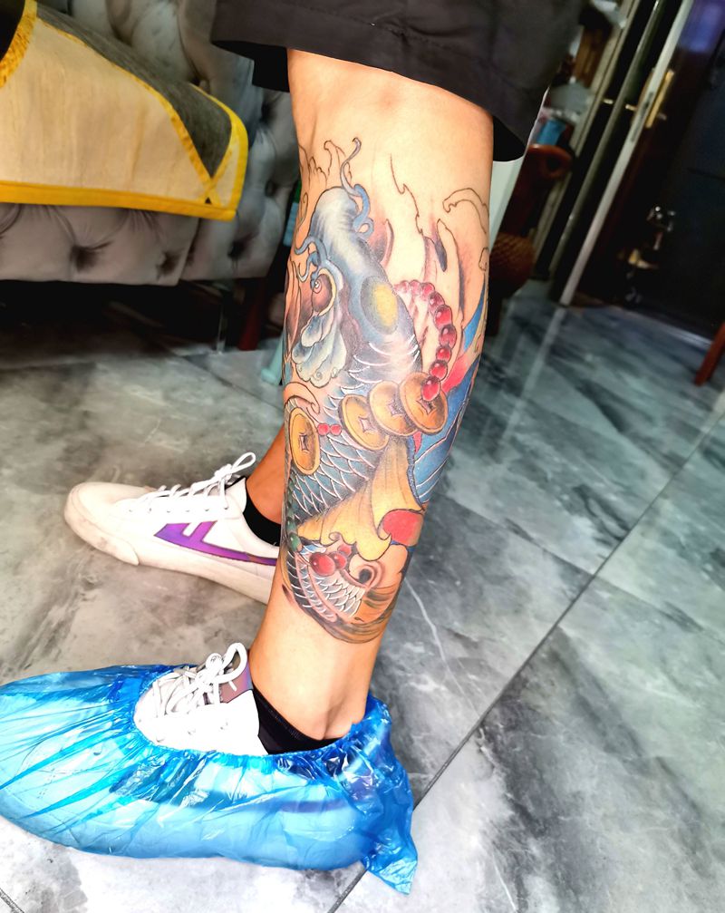 • T网红王老大花腿龙纹身图片_腿部新传统纹身图案