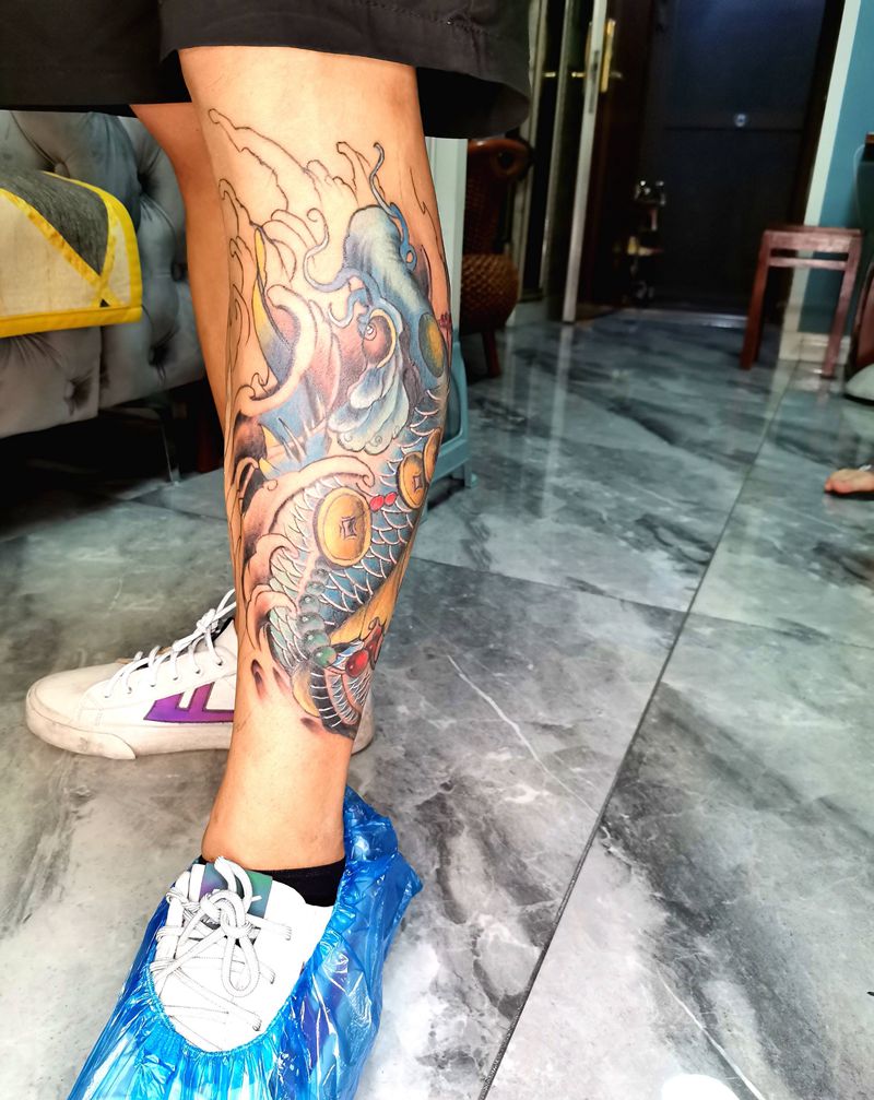 • T网红王老大花腿龙纹身图片_腿部新传统纹身图案
