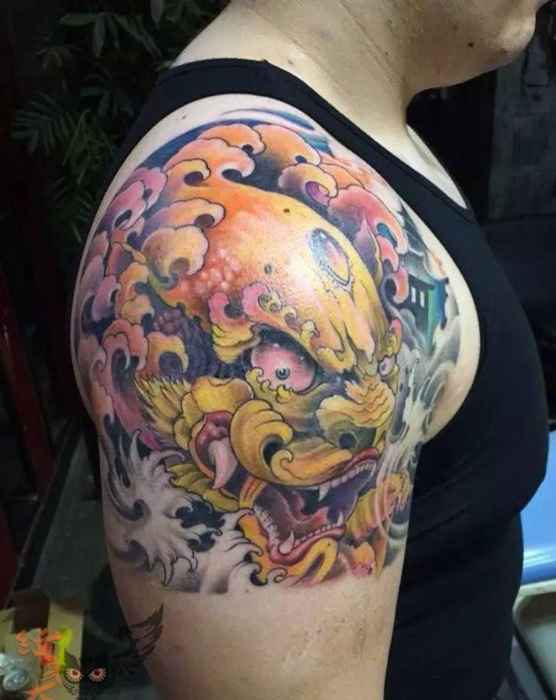 当前位置: 首页 >山东省济南市纹身店-老牛纹身工作室纹身图案>重彩唐狮纹身图片