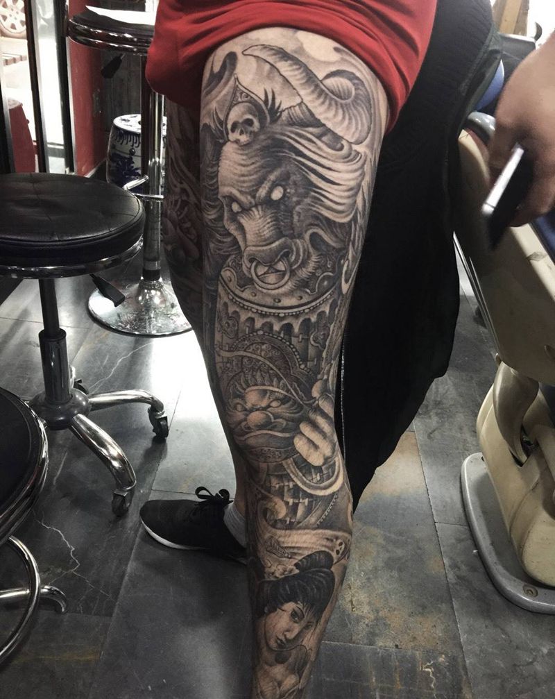 • T网红王老大花腿龙纹身图片_腿部新传统纹身图案