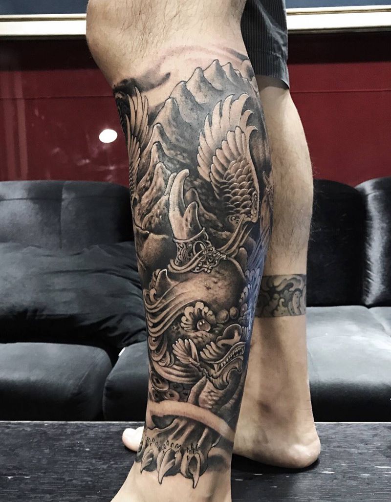 • T网红王老大花腿龙纹身图片_腿部新传统纹身图案