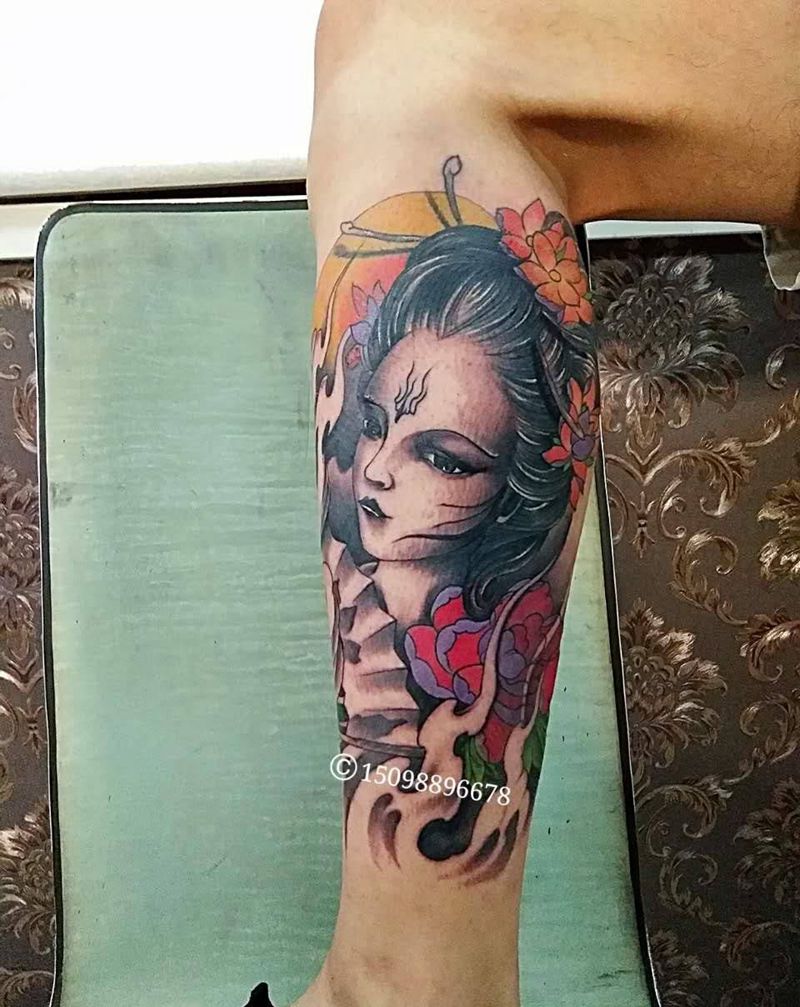 艺妓纹身图片_成品腿部传统人物纹身图案
