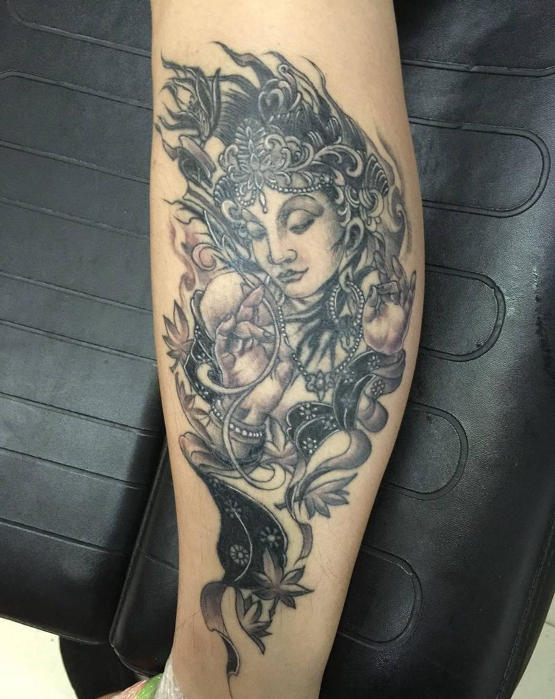 度母纹身图片_成品宗教传统腿部纹身图案