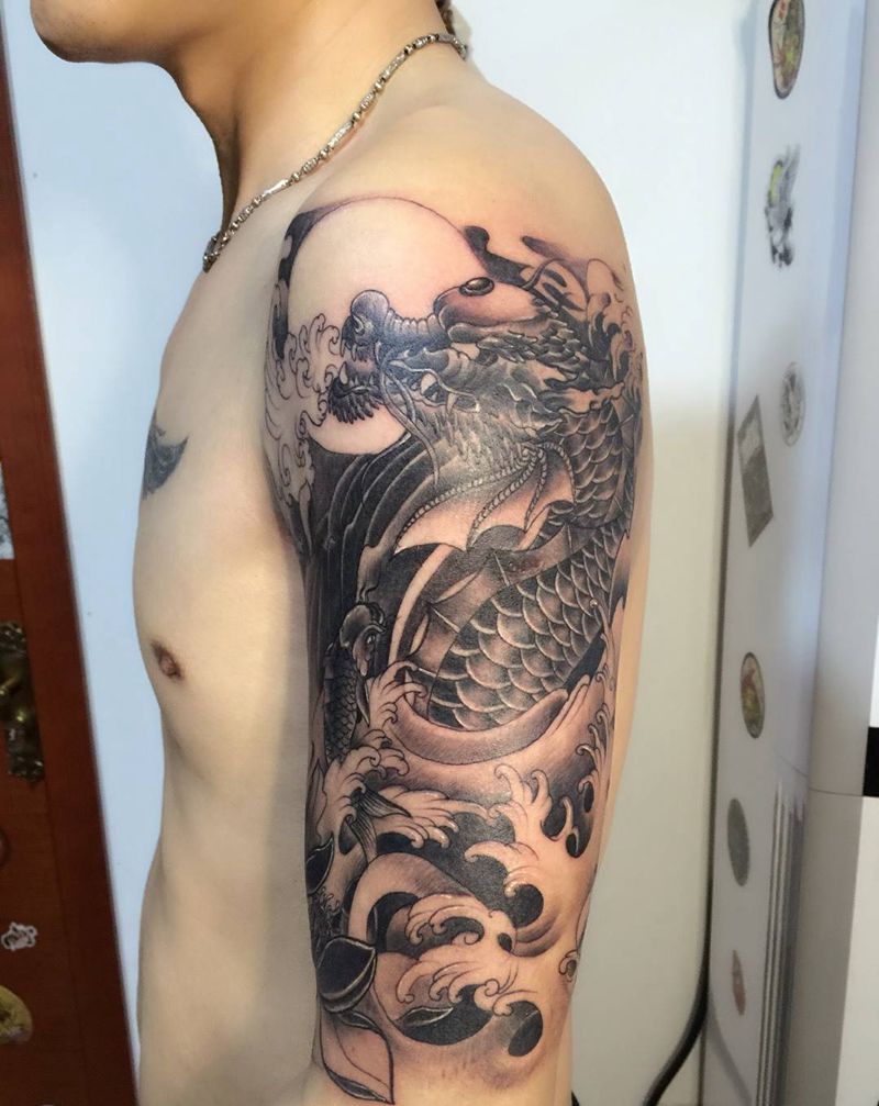 当前位置: 首页 >山东省济南市纹身店-太子纹身纹身图案>鳌鱼纹身图片_成品手臂传统动物纹身图案