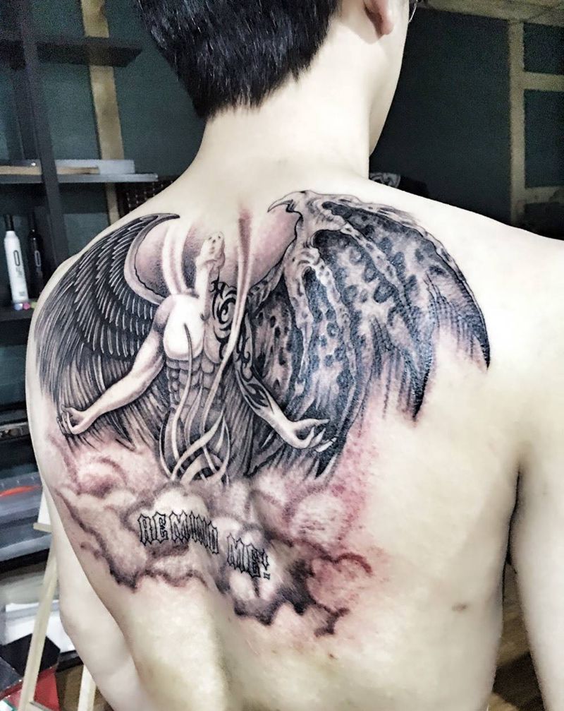 半背恶魔天使纹身图片_成品肩部胸部腰部背部传统欧美原创腹部人物纹身图案