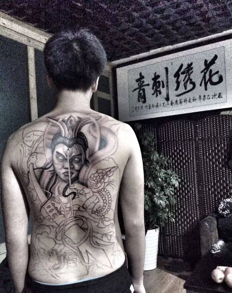 当前位置: 首页 >山东省济南市纹身店-花绣刺青纹身图案>满背二郎神纹身图片_成品背部手臂腿部传统人物鬼神原创宗教纹身图案