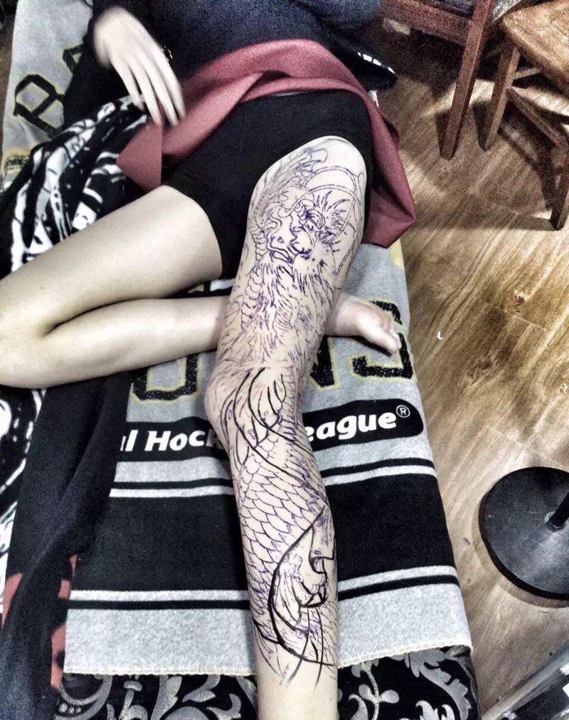• T网红王老大花腿龙纹身图片_腿部新传统纹身图案