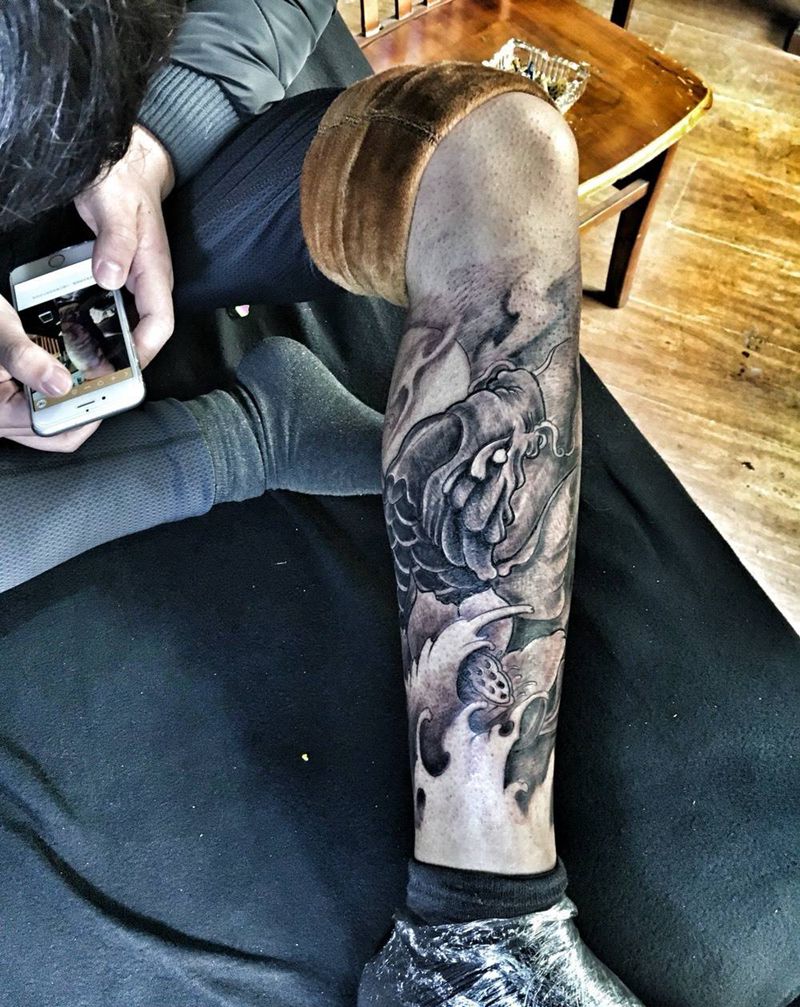 鲤鱼象神包小腿纹身图片_成品原创传统腿部肩部手臂背部腰部胸部腹部纹身图案