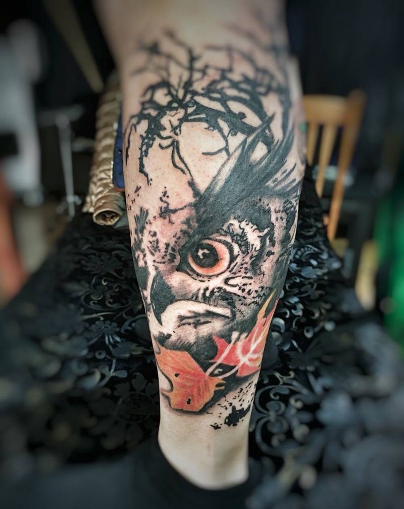 小腿猫头鹰纹身图片_成品原创传统欧美肩部背部腿部手臂腰部腹部纹身图案