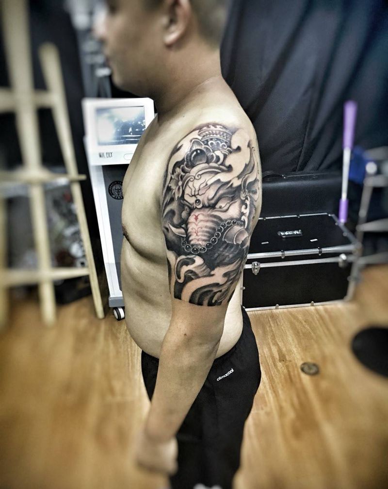 当前位置: 首页 >山东省济南市纹身店-花绣刺青纹身图案>大臂象神遮盖纹身图片