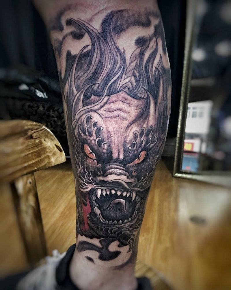 • T网红王老大花腿龙纹身图片_腿部新传统纹身图案