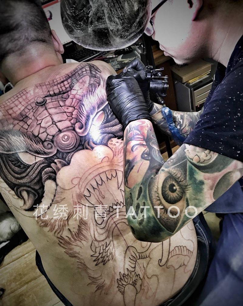 当前位置: 首页 >山东省济南市纹身店-花绣刺青纹身图案>满背龙未完纹身图片