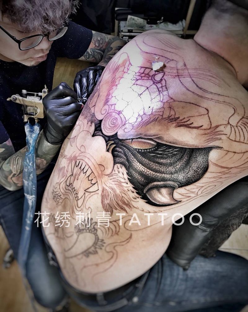当前位置: 首页 >山东省济南市纹身店-花绣刺青纹身图案>满背龙未完纹身图片