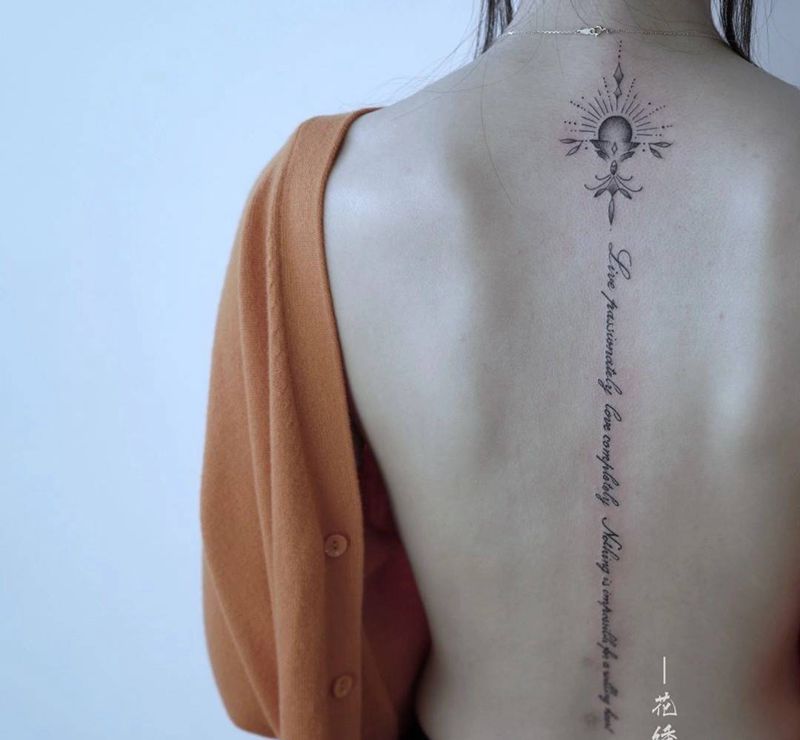 脊柱纹身图片_肩部背部花体字点刺纹身图案