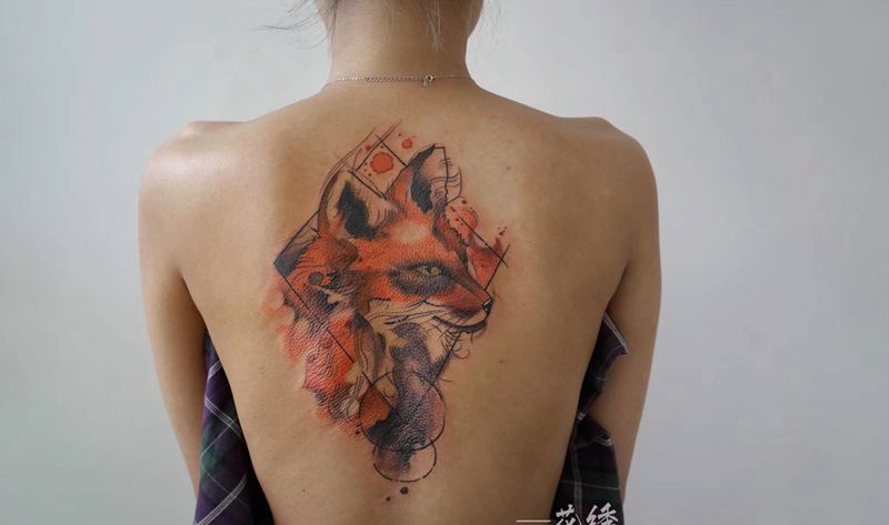 狐狸纹身图片_背部肩部水墨水彩纹身图案