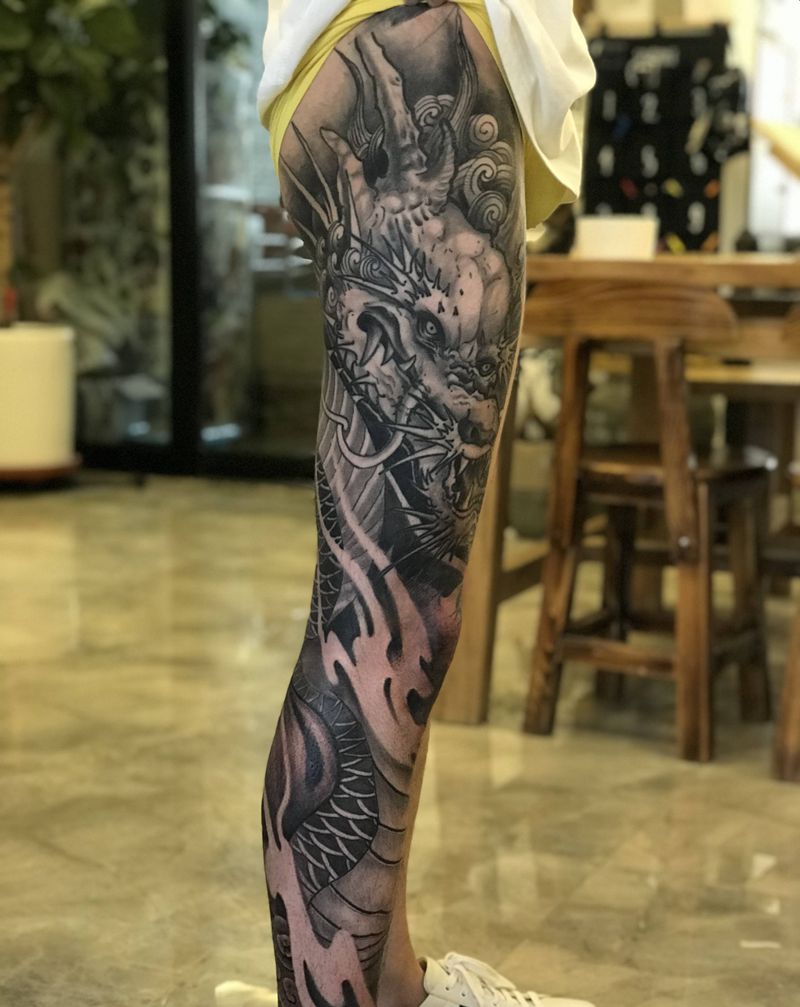 • T网红王老大花腿龙纹身图片_腿部新传统纹身图案