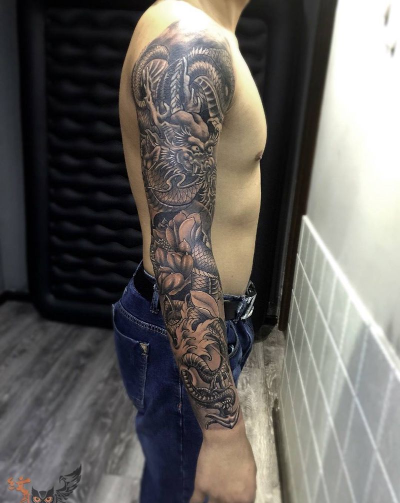 龙花臂 (大臂图腾遮盖)纹身图片_成品手臂传统鬼神纹身图案