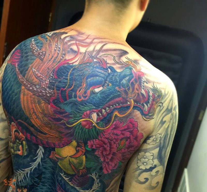 当前位置: 首页 >山东省济南市纹身店-翰墨刺青纹身图案>满背彩色龙遮盖纹身图片_成品背部传统鬼神纹身图案