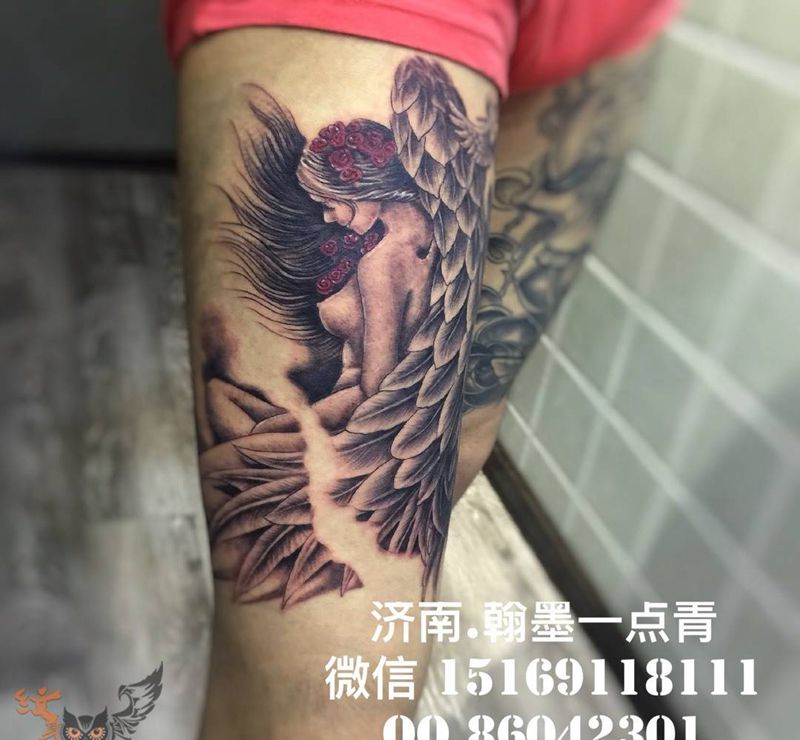当前位置: 首页 >山东省济南市纹身店-翰墨刺青纹身图案>大腿天使纹身图片_成品腿部欧美人物纹身图案