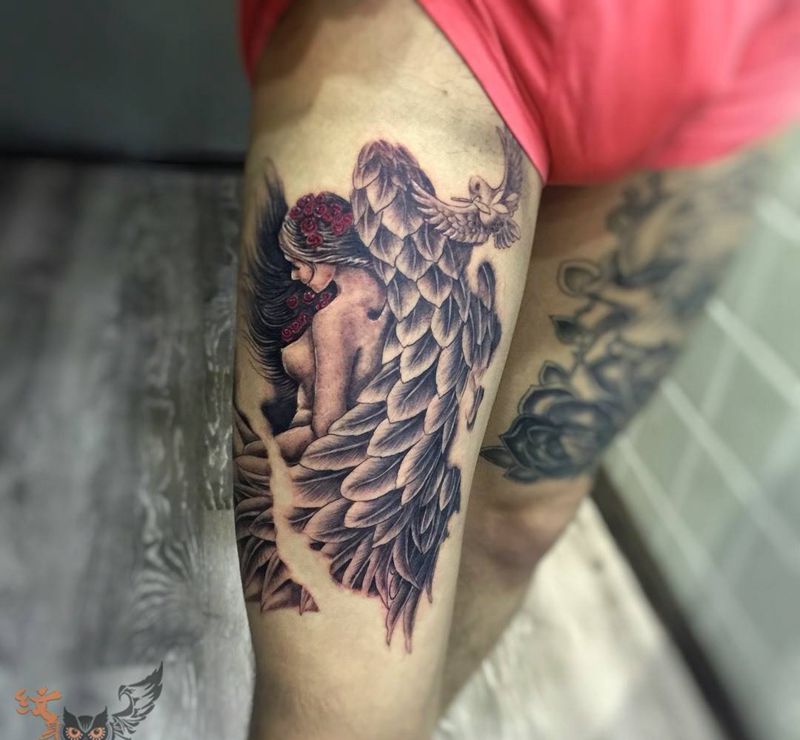 当前位置: 首页 >山东省济南市纹身店-翰墨刺青纹身图案>大腿天使纹身图片_成品腿部欧美人物纹身图案