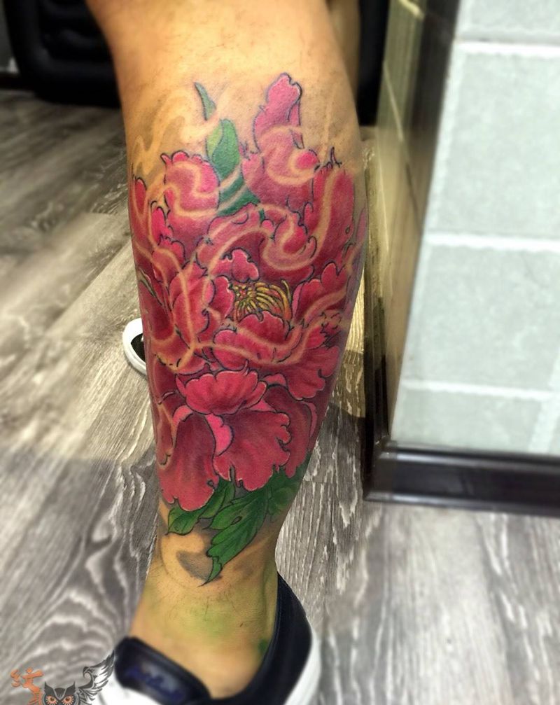 彩色牡丹包小腿纹身图片_成品腿部传统牡丹纹身图案