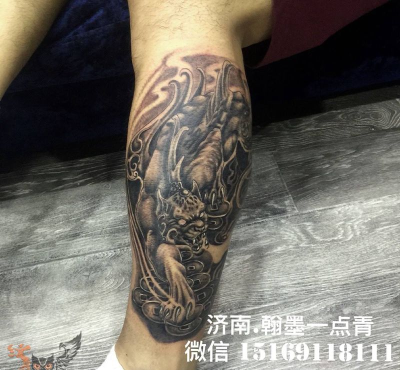 当前位置: 首页 >山东省济南市纹身店-翰墨刺青纹身图案>招财貔貅纹身图片_成品腿部传统神兽纹身图案