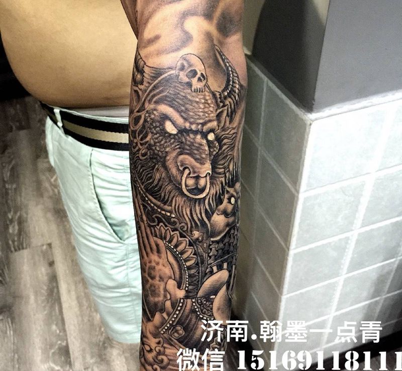 当前位置: 首页 >山东省济南市纹身店-翰墨刺青纹身图案>牛魔王纹身图片_手臂传统宗教纹身图案