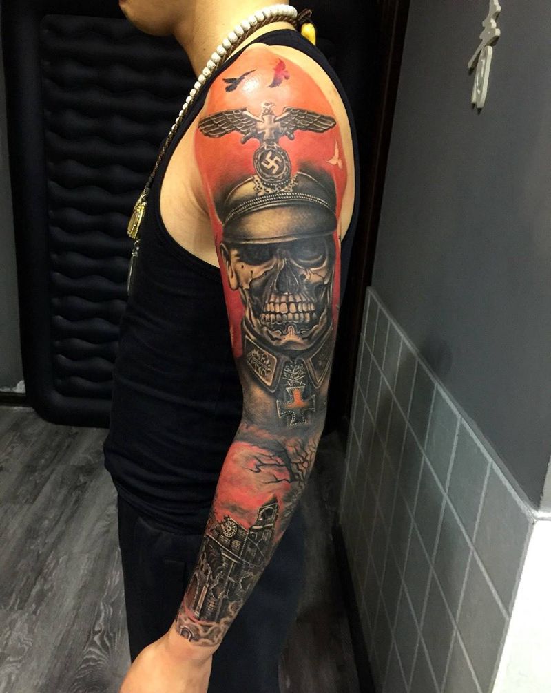 反战花臂纹身图片_手臂欧美人物成品纹身图案